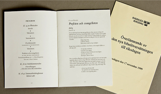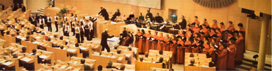 Wednesday November 17, 14.00 1999 Sweden’s Parliament Premier of the oratorio The Prophet and The Evangelist. The Royal Collage of Music´s chamber choir, childrens choir from Oscarskyrkan, Marie Göranzon narrarator, Lars Arvidsson baritone, Ulrik Qvale tenor and instrumental ensemble with Jesper Harrysson oboe and Samuli Örnströmer violoncello to only name a few. Conductors: Professor Anders Eby and Margareta Juul-Montelius. (Photo Carl-Johan Wilson)